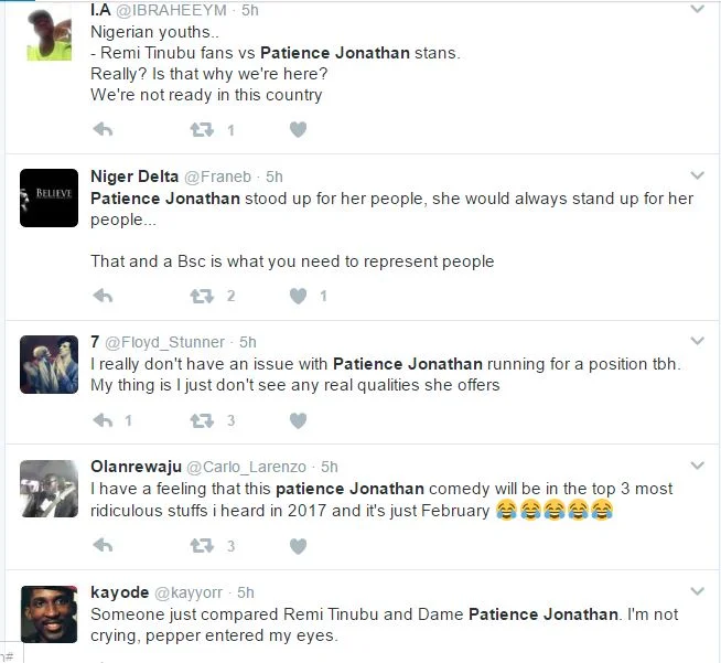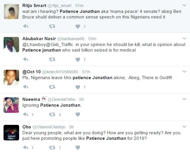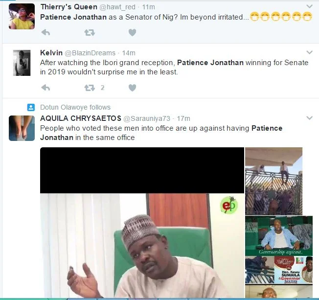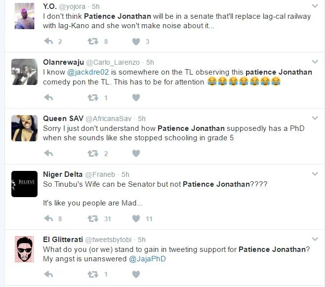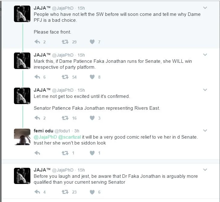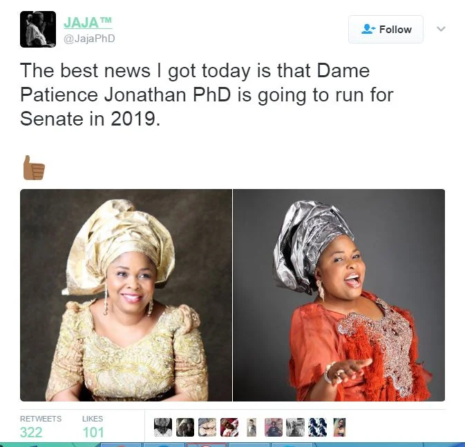 It all started when a twiiter user, @JajaPhD - JAJA tweeted that: "The best news I got today is that Dame Patience Jonathan PhD is going to run for Senate in 2019".