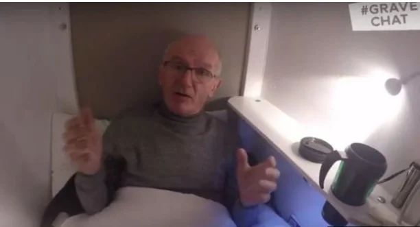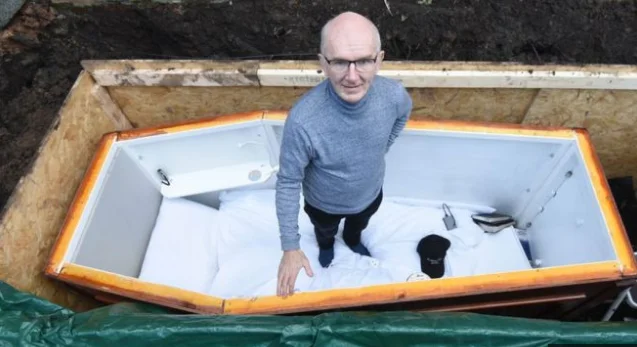 The coffin has been specially adapted so he can broadcast live on social media from underground