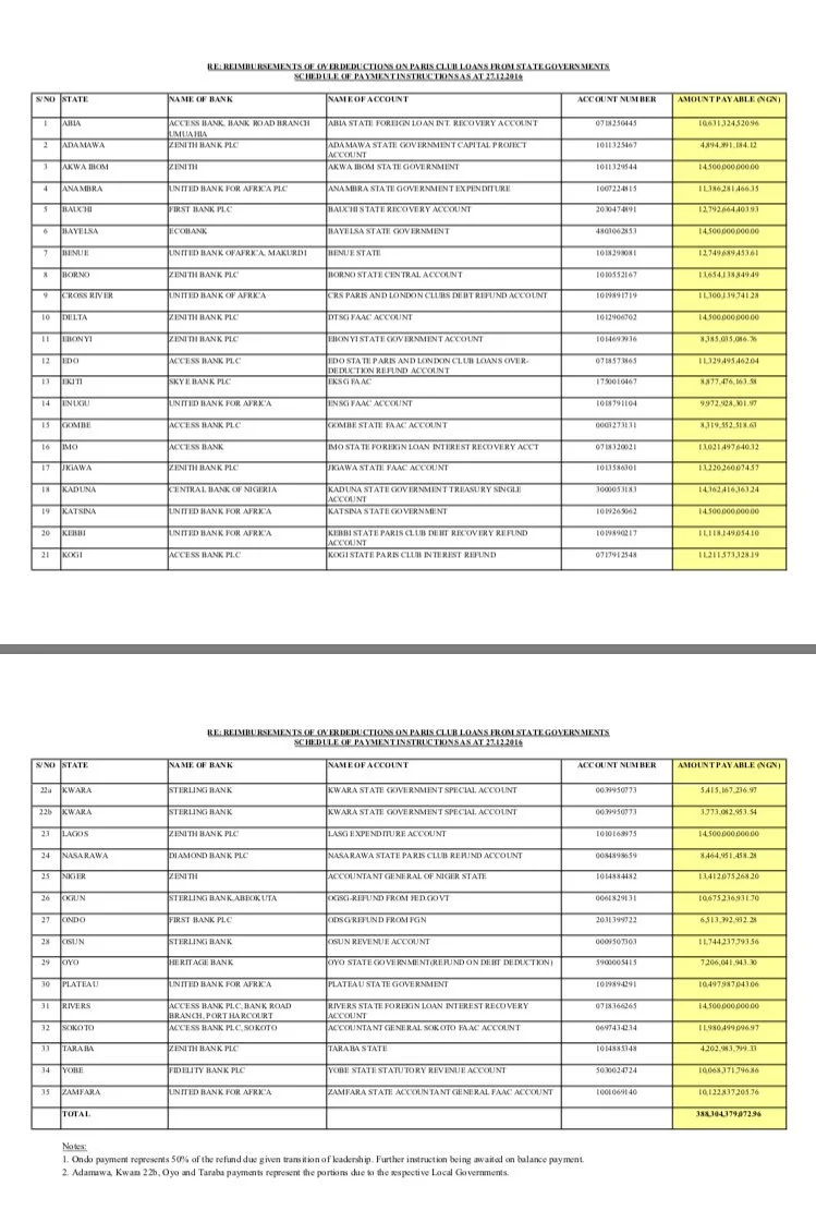 The Presidency has released details of the Paris Club Refund Tranche 1 which was released to state governments.