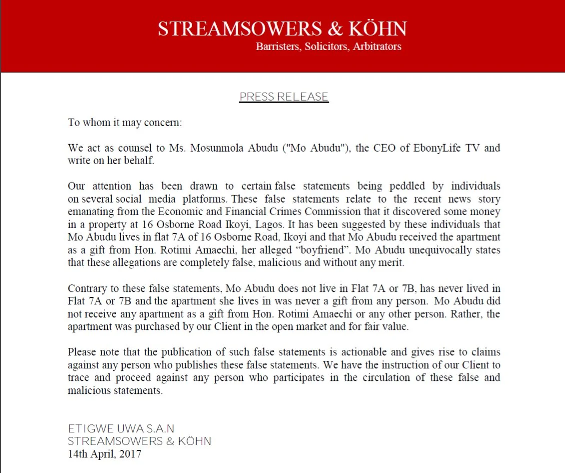 In a statement shared on her Instagram page, Mo, through her lawyers Streamsowers & Kohn, denied getting the flat from Amaechi.