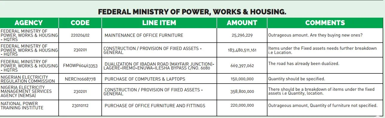 The document prepared and submitted by the civil organization to the National Assembly, when checked by Nigerian Bulletin shows that there are about 6 outrageous and suspicious items that raised various questions in Babatunde Fashola's ministry apart from other items on other ministries and parastatals of government.