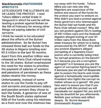 Member of defunct Plantashun Boiz, Blackface today lashed out at Tuface Idibia over the proposed anti-government protest.