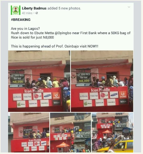 According to Liberty Badmus, there is ongoing sell of 50kg bag of rice for N8000 at Ebute Metta, Oyingbo near First Bank.